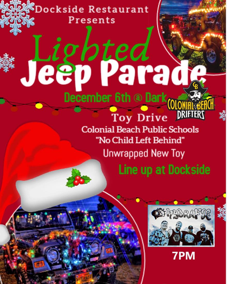 Lighted Jeep Parade! + Add to Google Calendar + iCal / Outlook export Date Dec 06 2025 Time 6:00 pm Location Dockside Restaurant & Tiki Bar 1787 Castlewood Dr, Colonial Beach, VA 22443 Website https://www.docksidetikibar.com Category Live Music Share this event